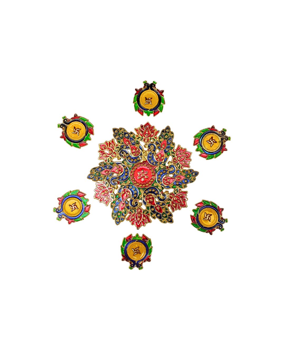Bring home a piece of beautiful tradition with this stunning 7-piece rangoli set made with intricately designed meenakari work. The centerpiece features various delicately designed peacocks with colorful patterns, while the six smaller pieces feature the auspicious swastik in each case. Not only are these pieces elegant, but they also add charm and positivity to any setting. The rangoli is simply for décor or peace decoration only. This rangoli will enhance the visual beauty of your entrance, table, or any space bringing elegance and festive cheer to life. A considerate way to incorporate pristine handcrafting and cultural grace into your home.