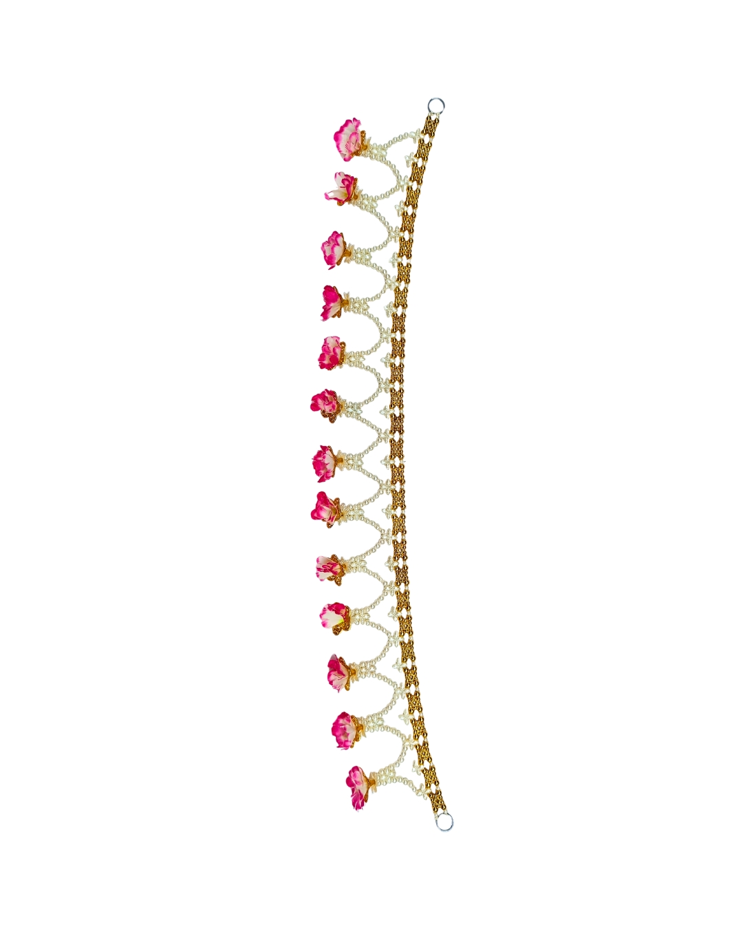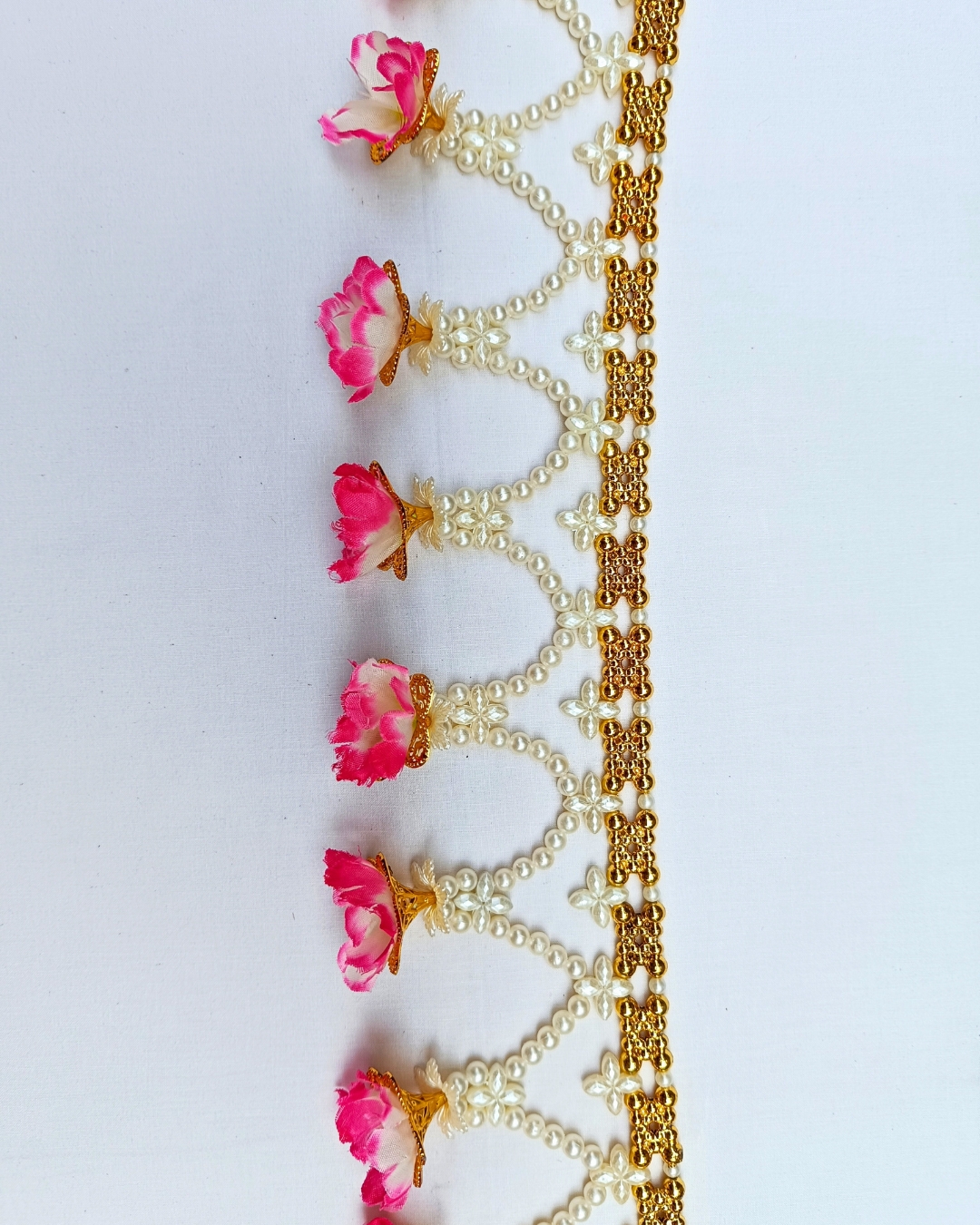Add a warm welcoming touch to your home with this handcrafted toran made of pearl-like moti strings and delicate artificial flowers. The delicate golden details combined with gentle pink flowers produce a refined mix of tradition and sophistication. With a lovely combination of tradition and elegance, this handcrafted three-tiered toran will maximise the warm welcoming touch wherever it hangs.
